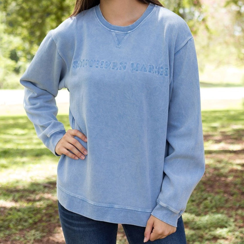 Our custom SEAWASH™ colors are now available in the comfiest sweatshirt you’ll ever throw on. Made with 100% cotton, the softness of this terry crewneck sweatshirt will keep you comfortable and warm. A must-have for those cool nights out on the beach with friends, or anytime you have a little chill. Finished with custom Southern Marsh lettering and an embroidered duck on the back collar.